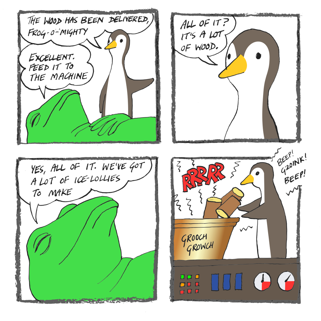 Frog-o-Mighty is stoking up his ice lolly machine to dangerous levels, in order to fulfill a big order for a very important person’s garden party.