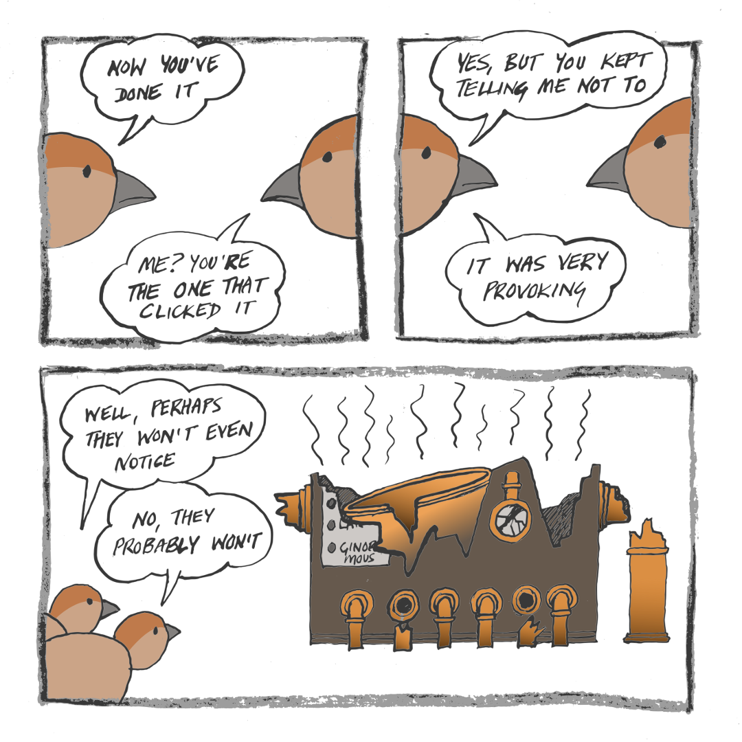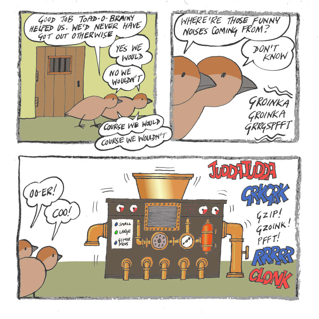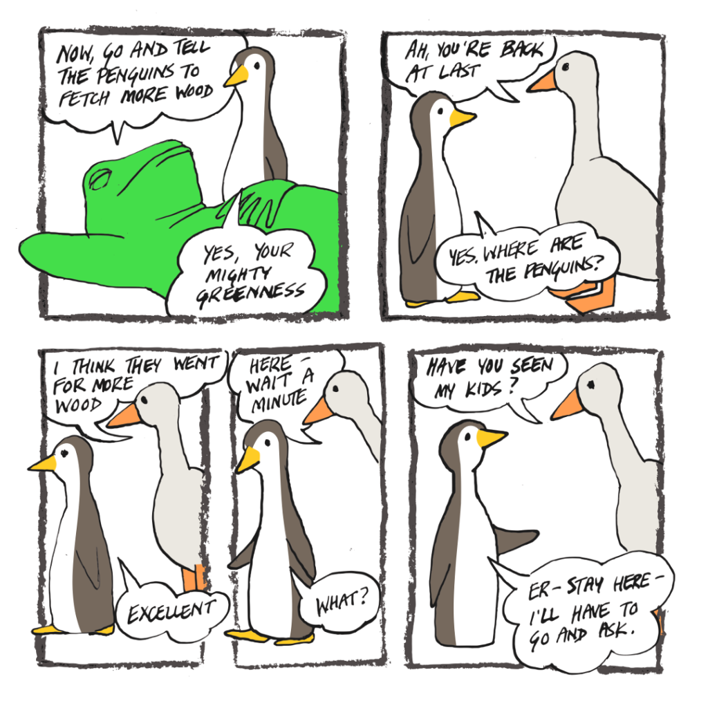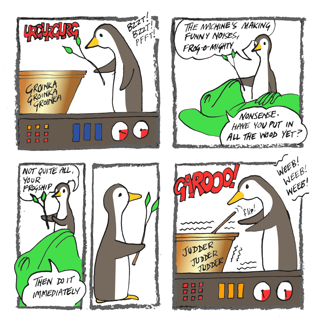 The penguin tries to warn Frog-o-Mighty that the ice lolly machine is making funny noises, but Frog-o-Mighty won’t listen.