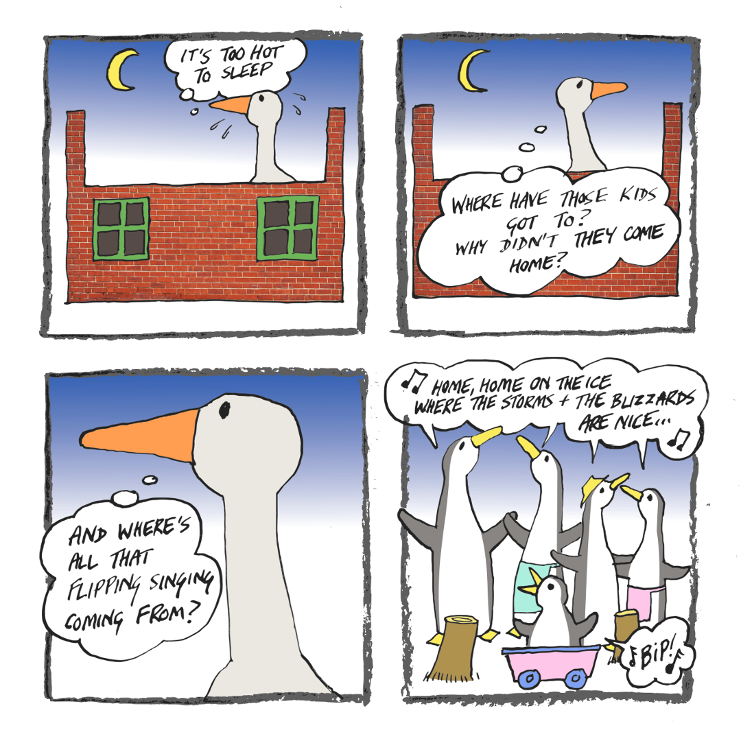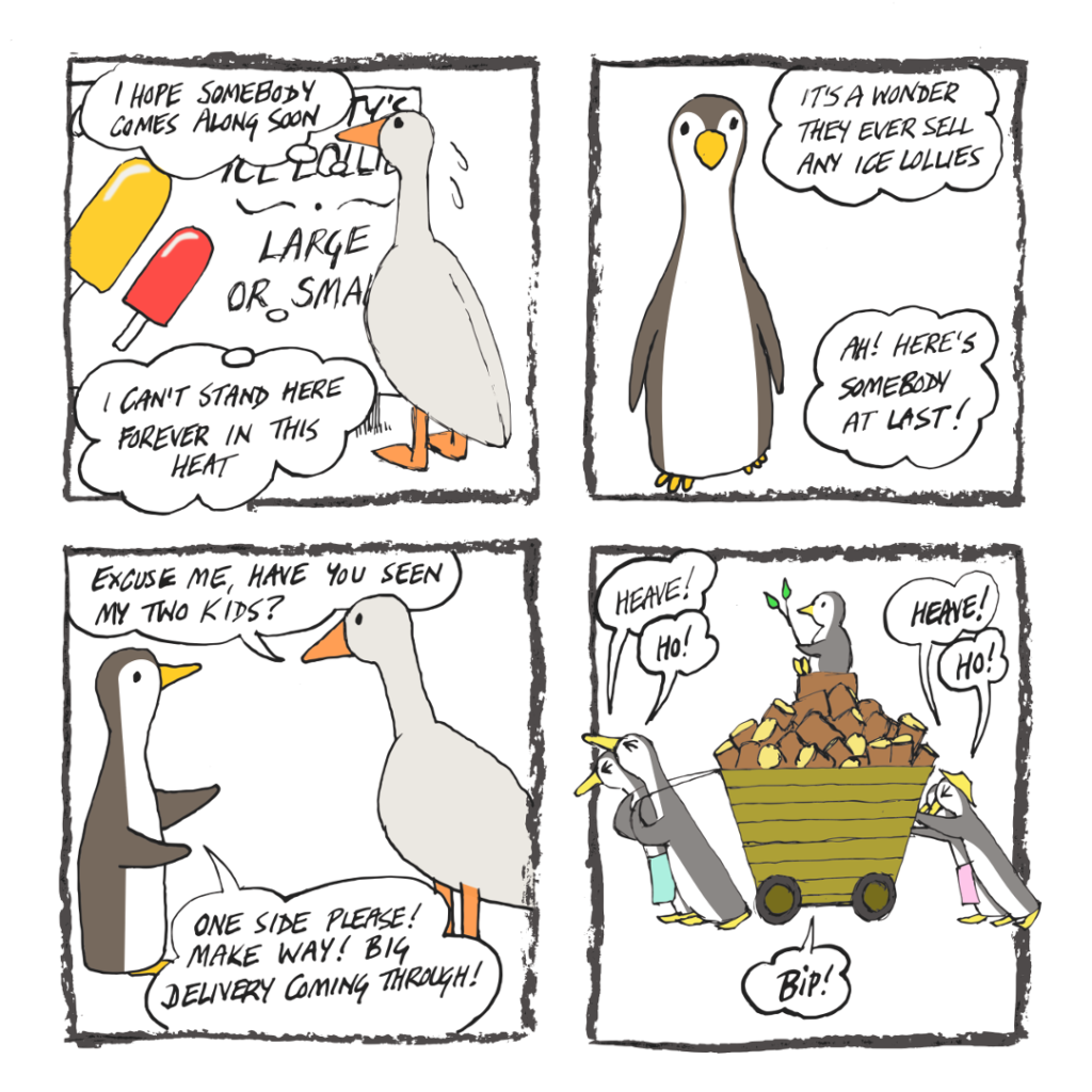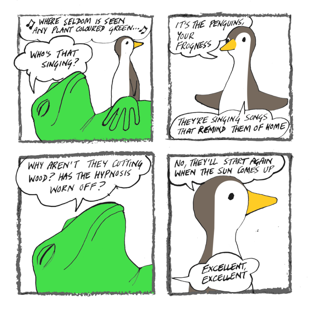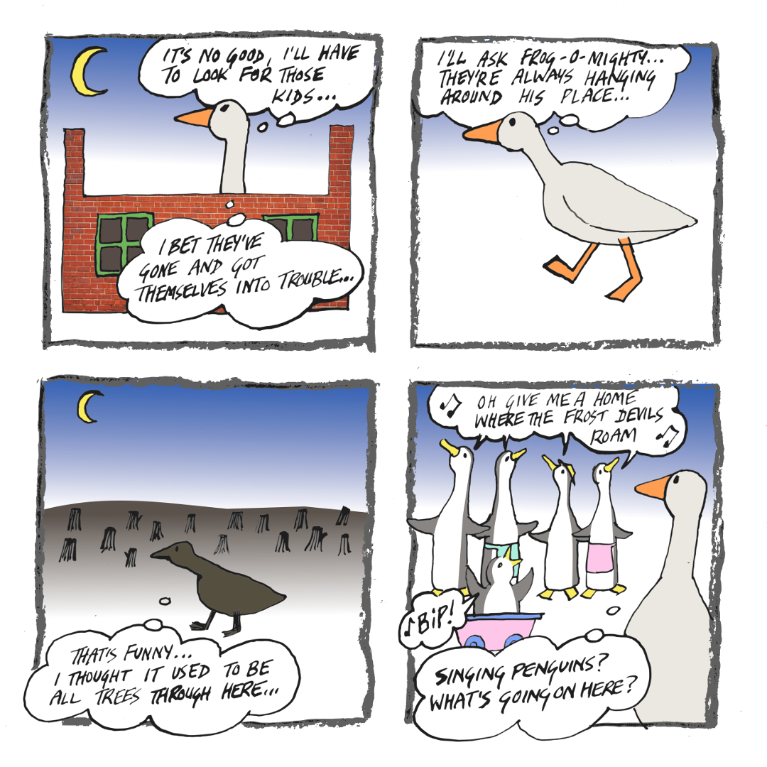 The goose Dad is outside Frog-o-Mighty’s place, looking for the kids – but his inquiries are interrupted by a massive delivery of wood.