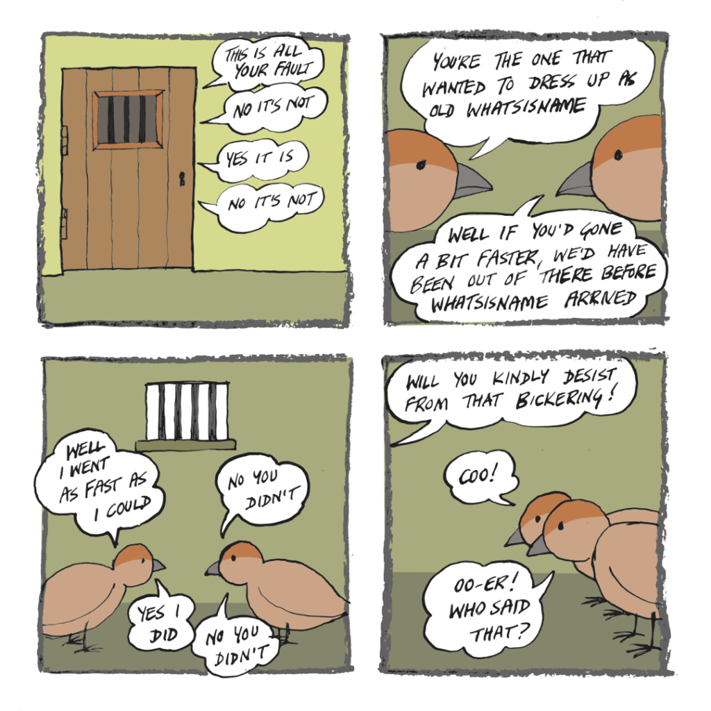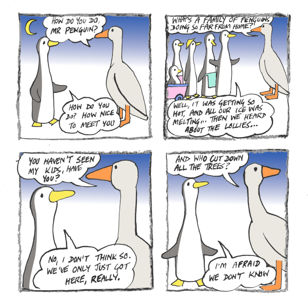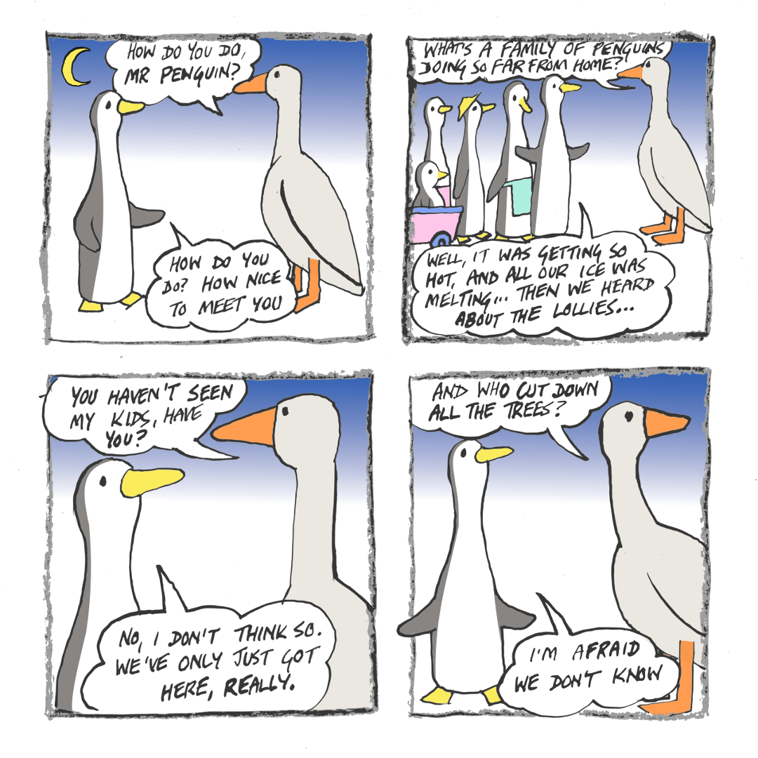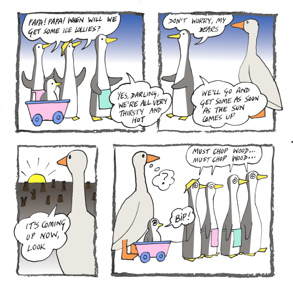 The goose Dad is outside Frog-o-Mighty’s place, looking for the kids – but his inquiries are interrupted by a massive delivery of wood.